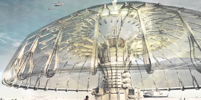 Designed to rebuild the shrinking polar ice sheets affected by global warming, the Polar Umbrella is a buoyant skyscraper designed by Derek Pirozzi. Through its desalinization and power facilities, the Polar Umbrella resembles a floating metropolis equipped with NOAA (National Oceanic and Atmospheric Administration) research laboratories, renewable power stations, dormitory-style housing units, eco-tourist attractions, and ecological habitats for wildlife. The structure will travel to the most affected areas where global warming has caused the most damage to the Earth’s protective ice cover and reconstitute layers of ice before moving on to other locations.